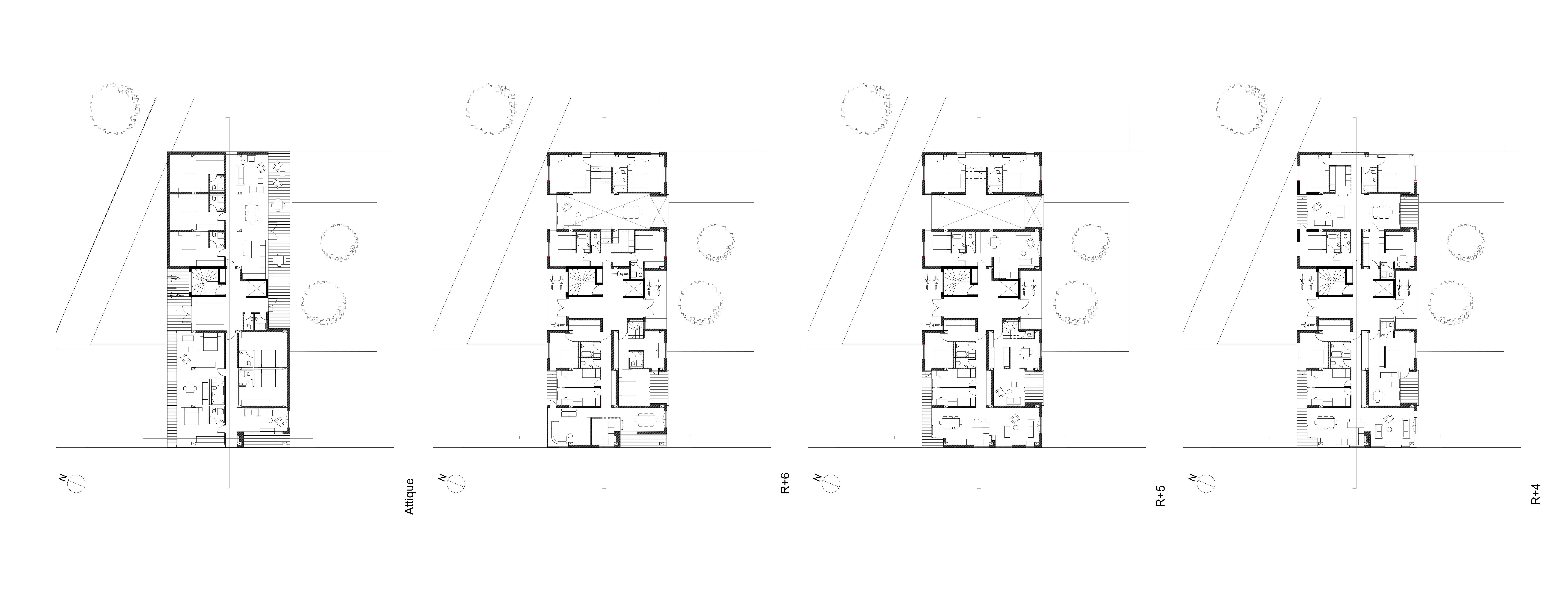 Les logements se répartissent du R+4 au R+17, selon un modèle de 3 niveaux qui se réitère 4 fois, le R+3 étant réservé l’espace de travail et d’une terrasse en sur hauteur, et le dernier niveau par un cluster en attique avec séjour au sud.