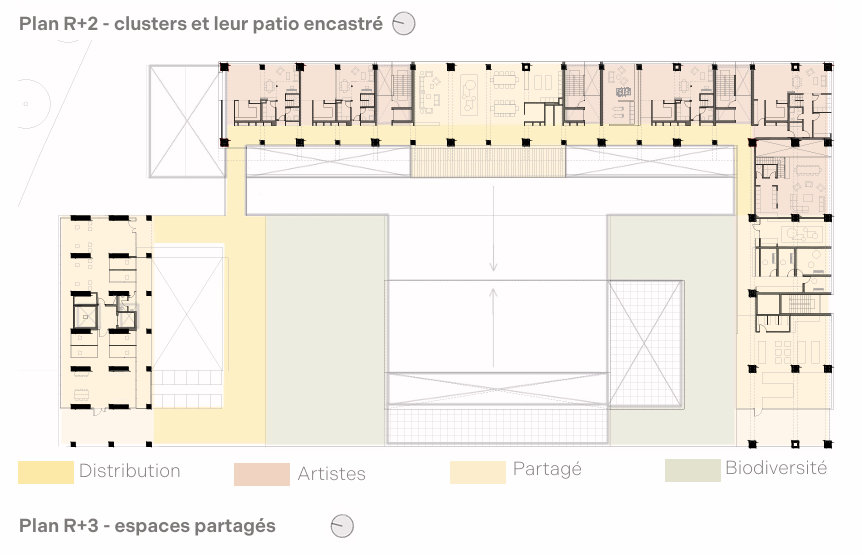 Dans une optique de respect de la loi ZAN (zéro artificialisation net), la densification de la parcelle s’est donc faite principalement sur l’emprise du bâtiment existant, lui-même transformé en espaces d’ateliers profitant de la liberté du plan permise par la trame de 10m par 10m. A l’Est, trois bâtiments de logement renouent avec le tissu pantinois, créent un axe secondaire vers le canal pensé piéton (dans l’axe de l’ancienne rampe).