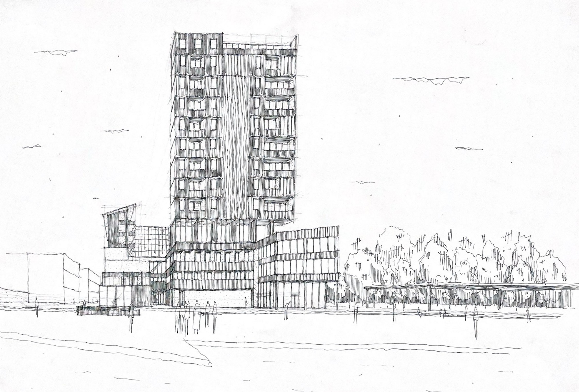 La densification de la parcelle proposée par l’exercice imposait une certaine verticalité si nous voulions conserver un grand espace non construit. Pour des questions d’orientation et des enjeux structurels, la tour s’implante sur les deux trames existantes les plus au nord. Celles-ci avaient été doublée, laissant une trame de 5x5m dans les étages inférieurs, destinés à des logements d’urgence.