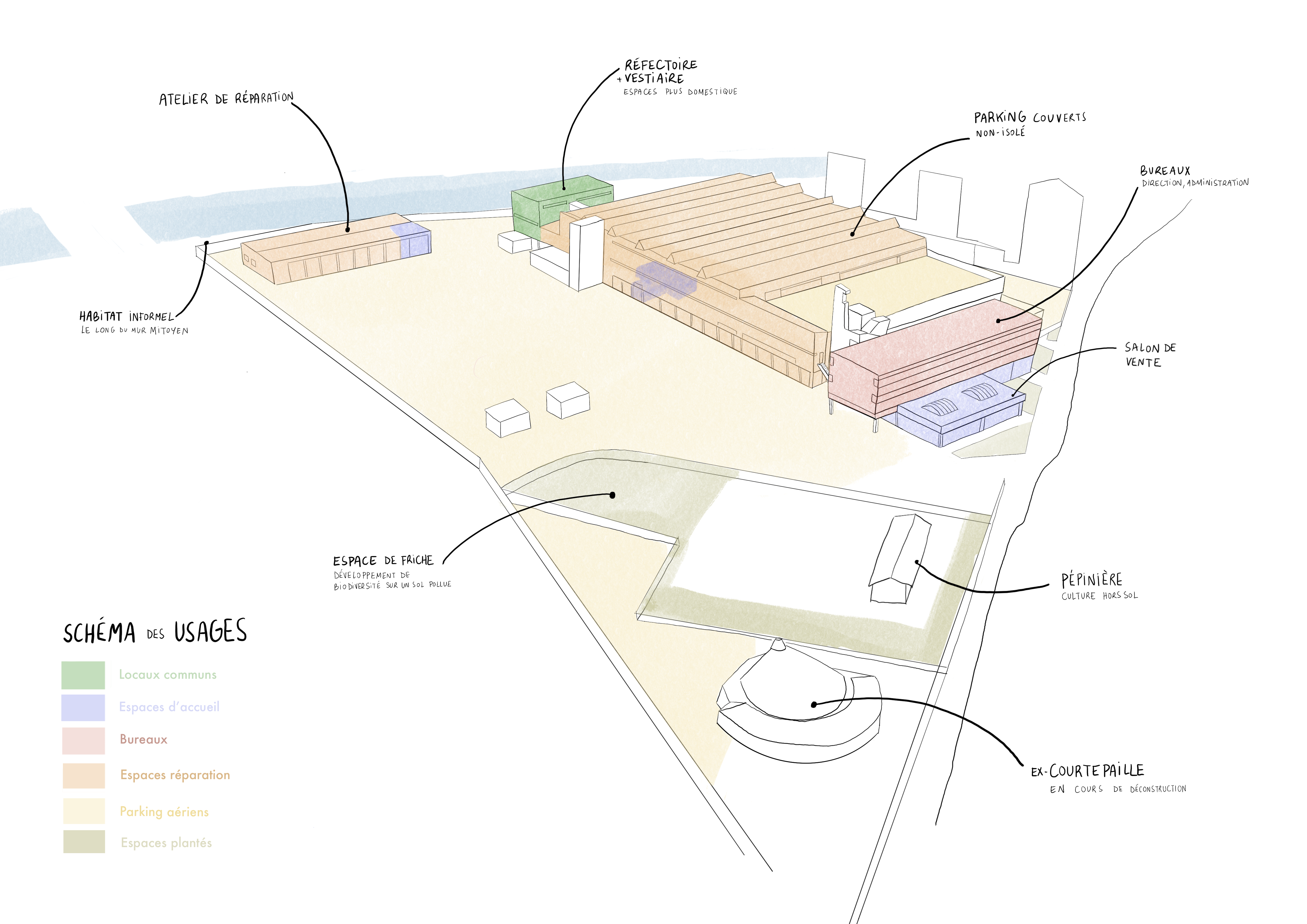 A l’image de 4 agences d’architectures qui auraient pu être appelées sur ce projet, nous avons réfléchi individuellement chaque plan, tout en gardant une cohérence commune, pour le choix du bois pour la structure et la façade par exemple, ou pour l’occupation du R+3. La dalle supérieure du site existant était l’opportunité de relier 3 des bâtiments par une promenade commune en toiture, desservant proposant des services différents selon les 3 déclinaisons : une buanderie côté rue, un espace de travail côté canal, une salle polyvalente côté venelle, un potager extérieur et un atelier de réparation.