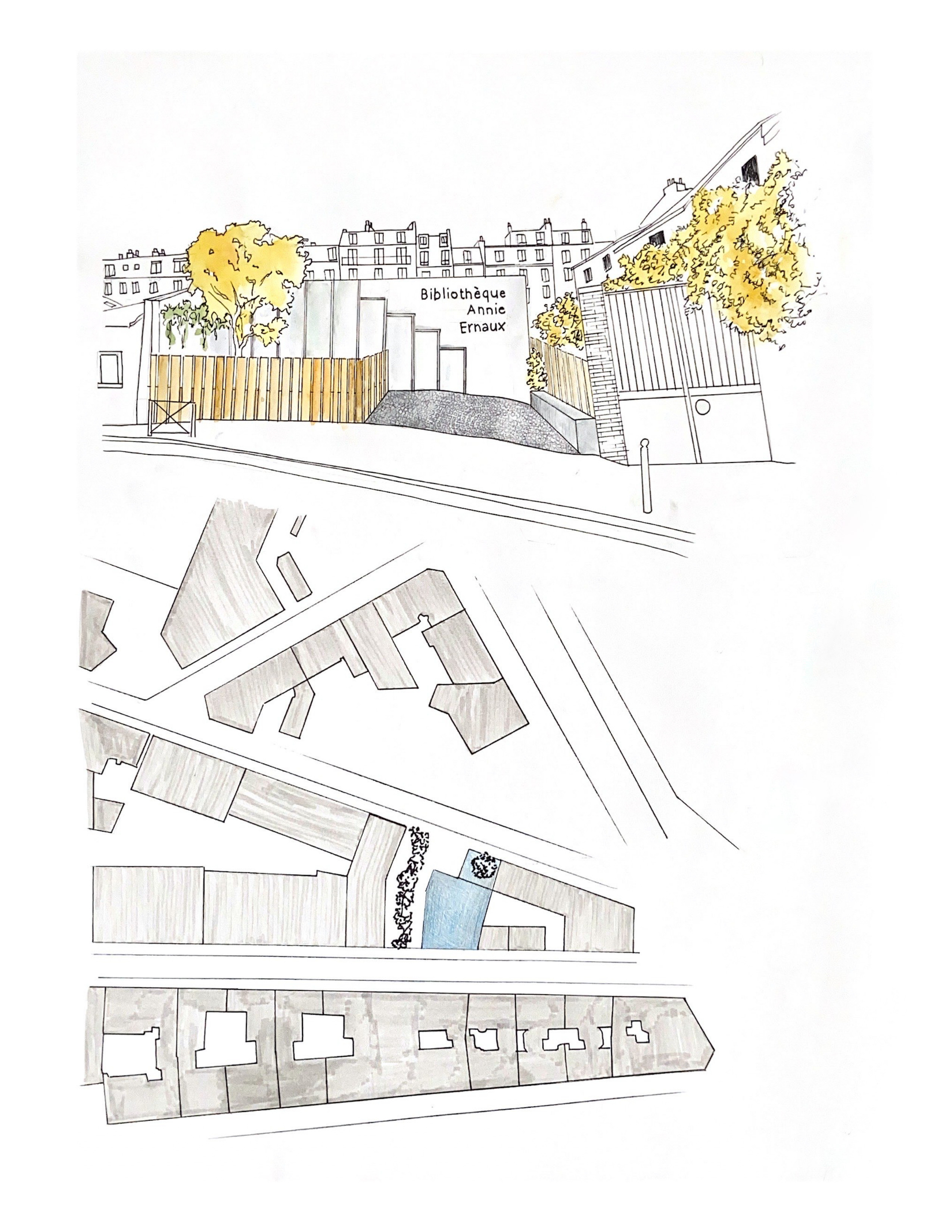 Cet exercice commun à tous les ateliers prend place dans le 20ème arrondissement de Paris (quartier Goncourt), sur une parcelle laissée en friche depuis plusieurs années. L’objectif étant de nous initier à l’arpentage de site, au travail des niveaux et de l’échelle du micro-quartier.