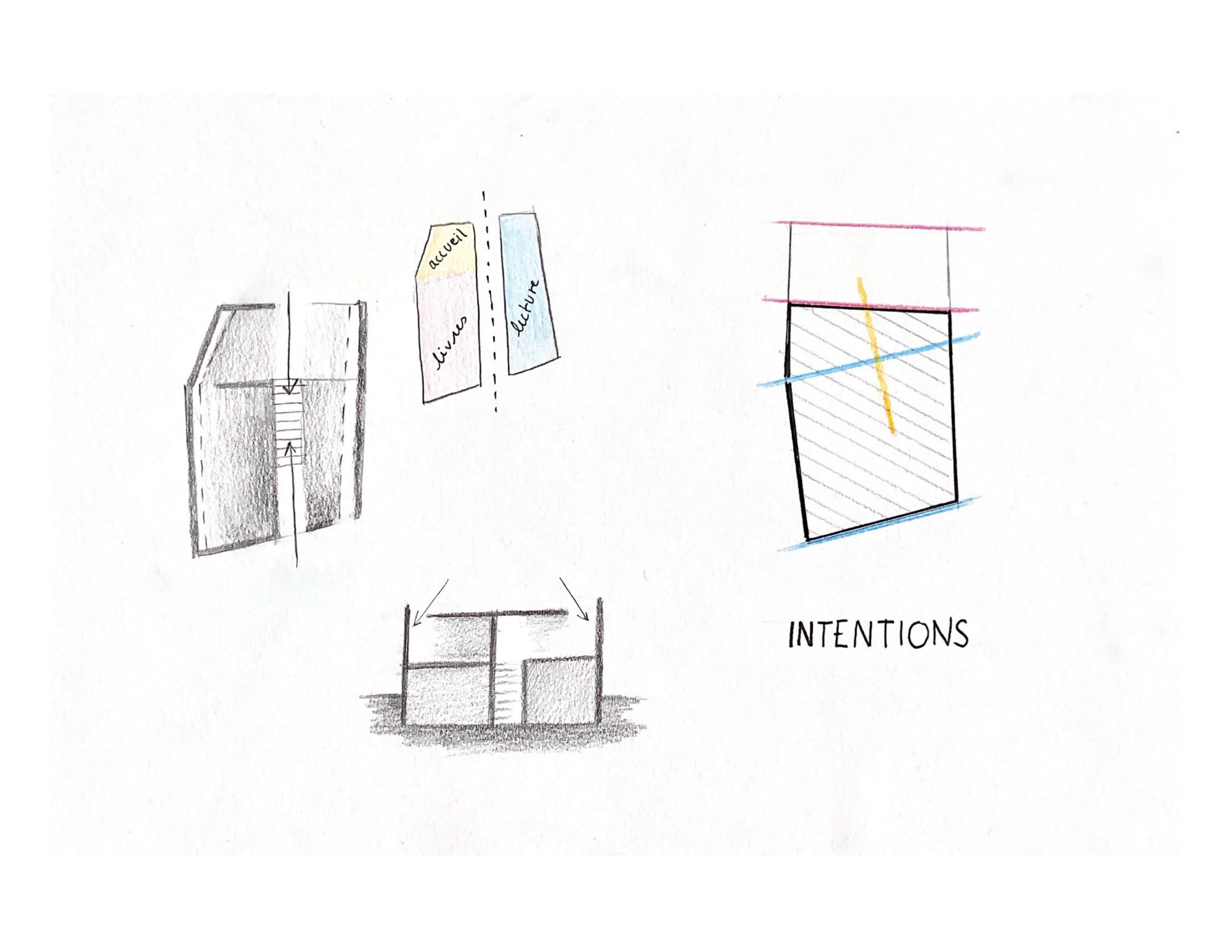 L’enjeu était d’organiser 3 espaces distincts : L’espace de travail, le stockage des livre et la salle de lecture, le tout en gérant la différence de niveau sans enlever ou de rajouter de la terre (nécessairement déblais->remblais).