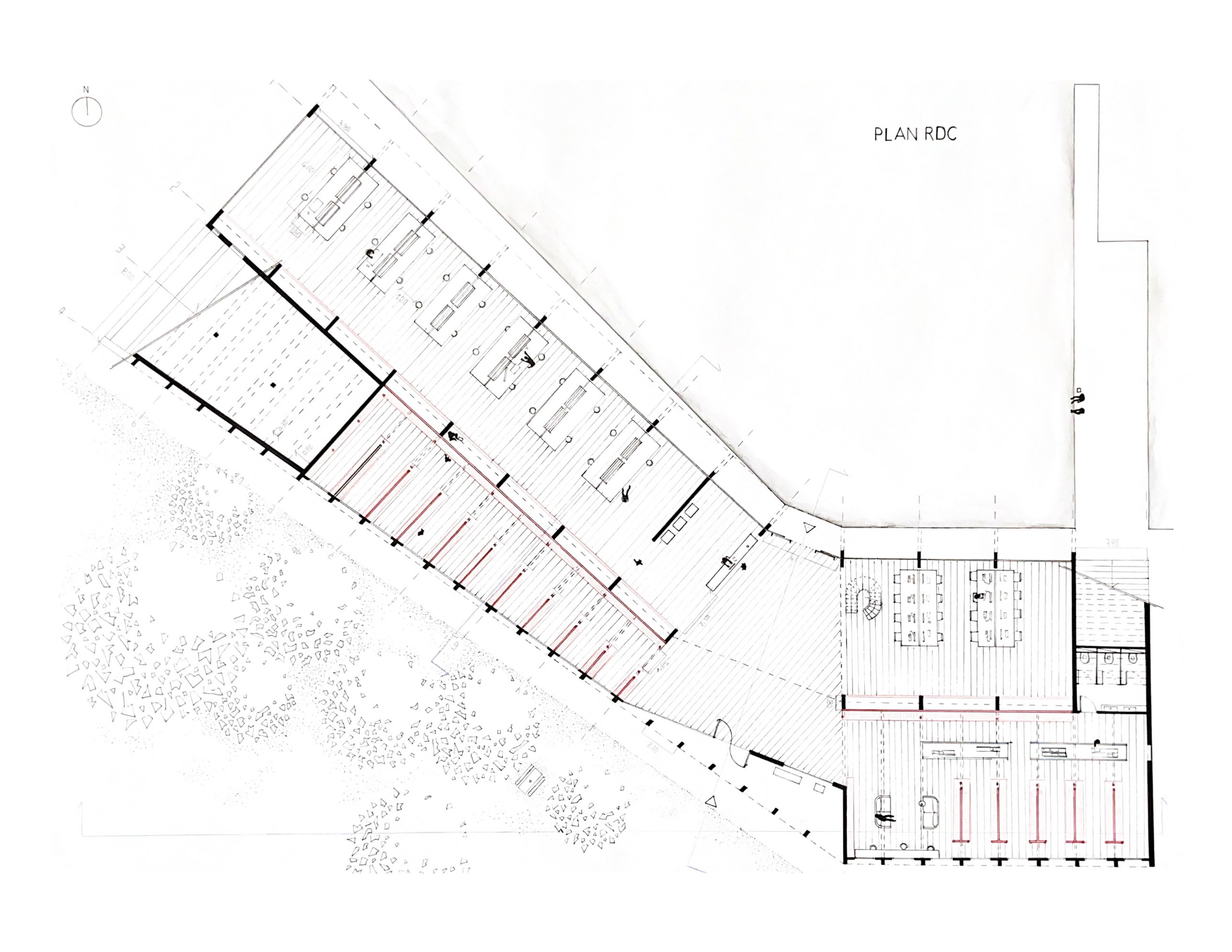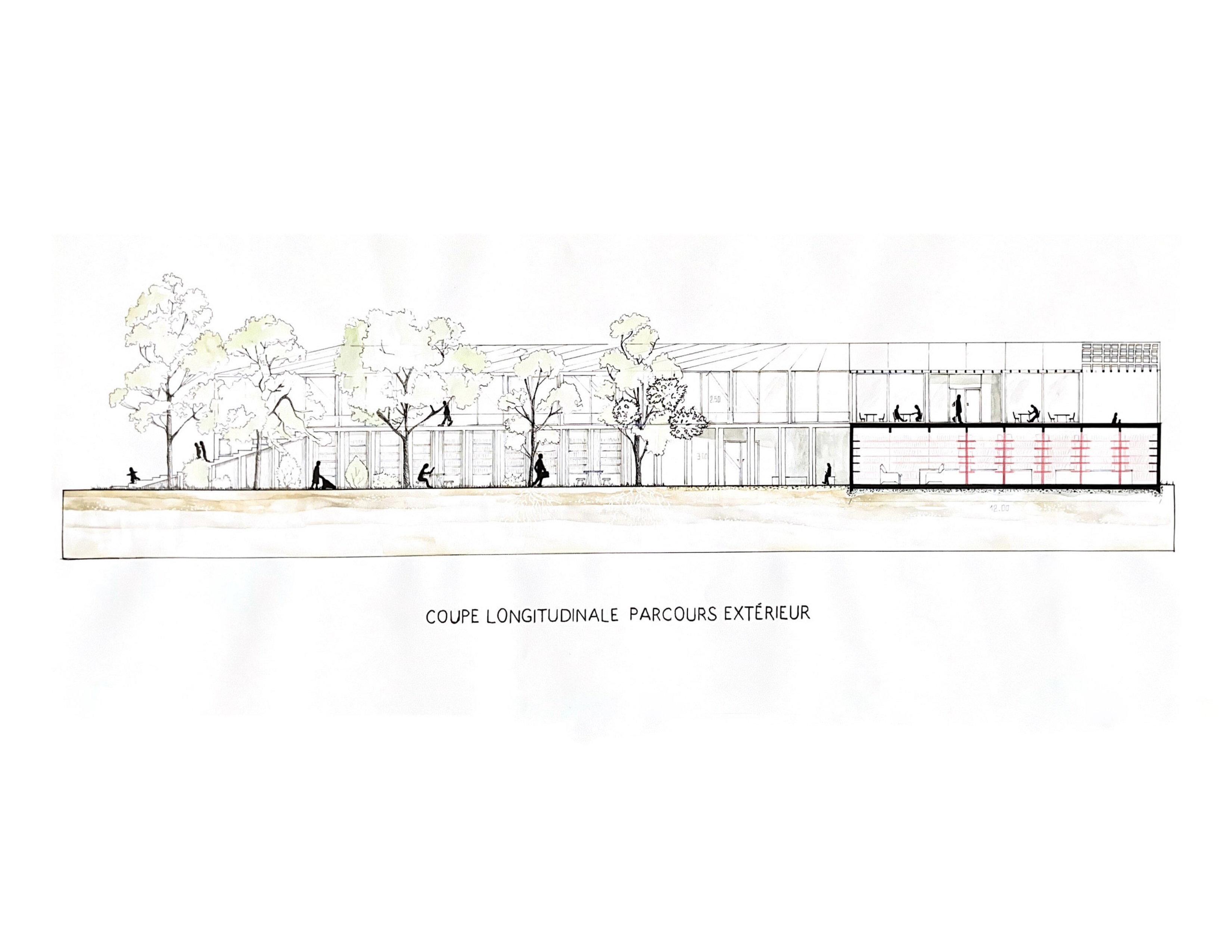 A l’Est, l’espace se divise dans la verticale et une cafétéria accessible par l’extérieur est située sur une mezzanine, tandis qu’un espace plus intime, nait au rez-de-chaussée.