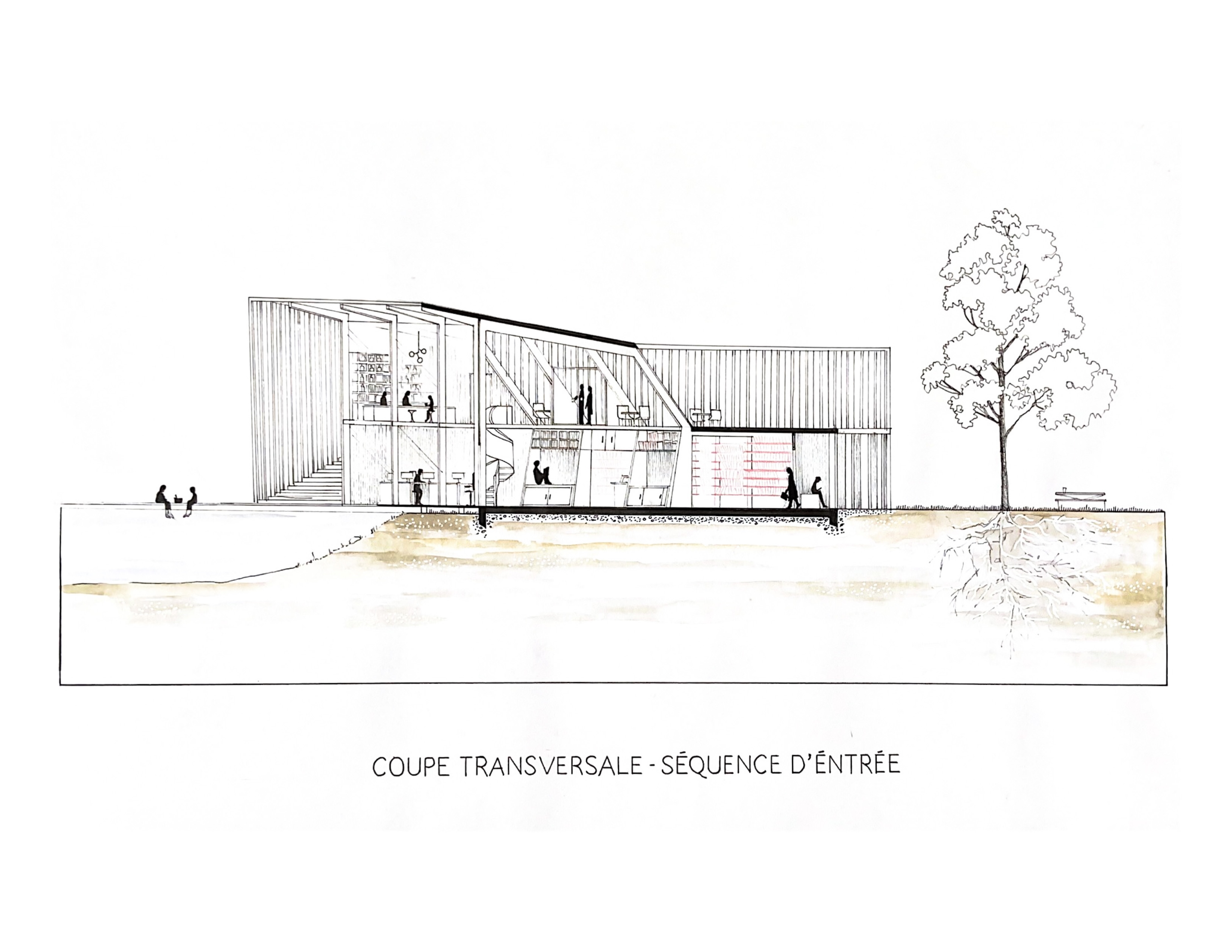 Cette bibliothèque s’inspire de l’architecture navale et de son rapport entre le bois et l’eau. Tout en longueur, le bâtiment se divise en deux espaces : la salle de travail, et la bande de service (où se trouve en particulier le stockage des livres) qui s’y adosse. La volumétrie générale se désarticule au niveau de l’entrée.
