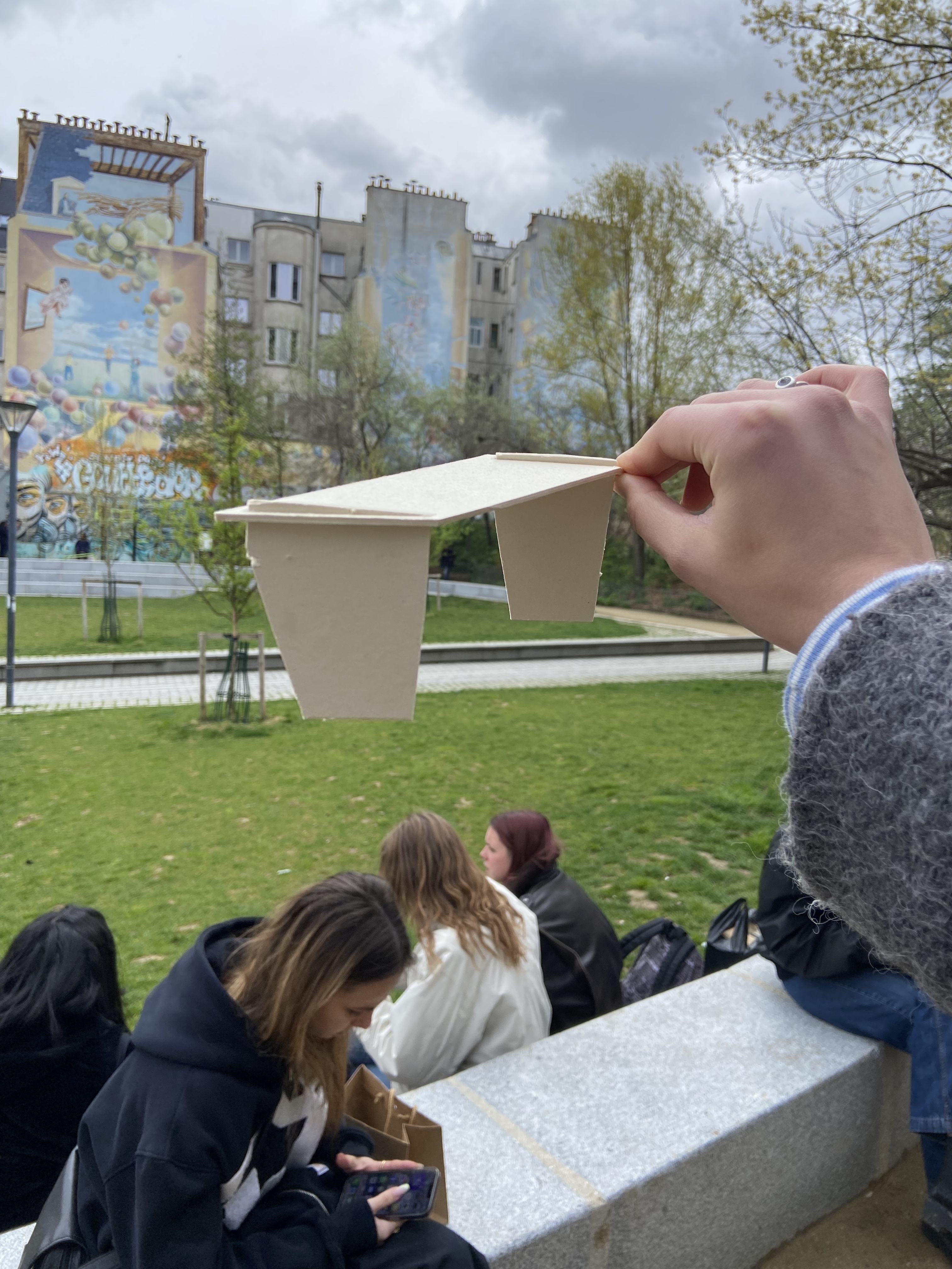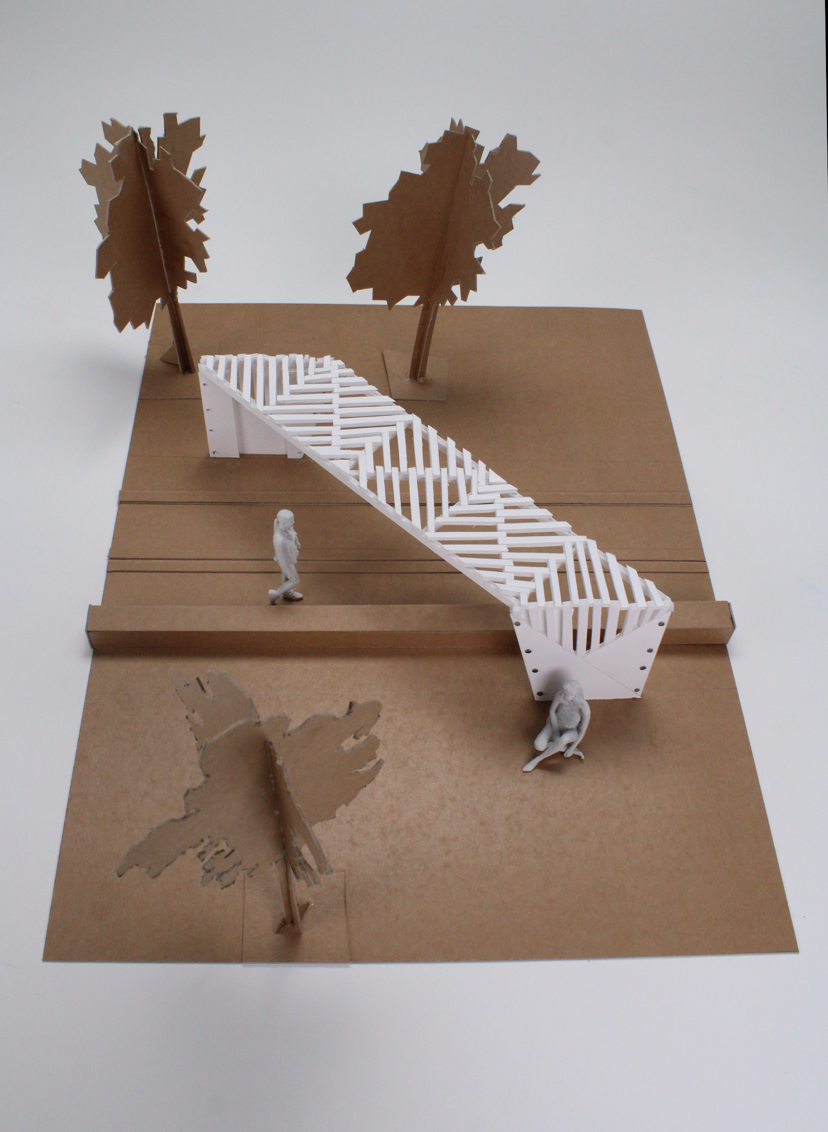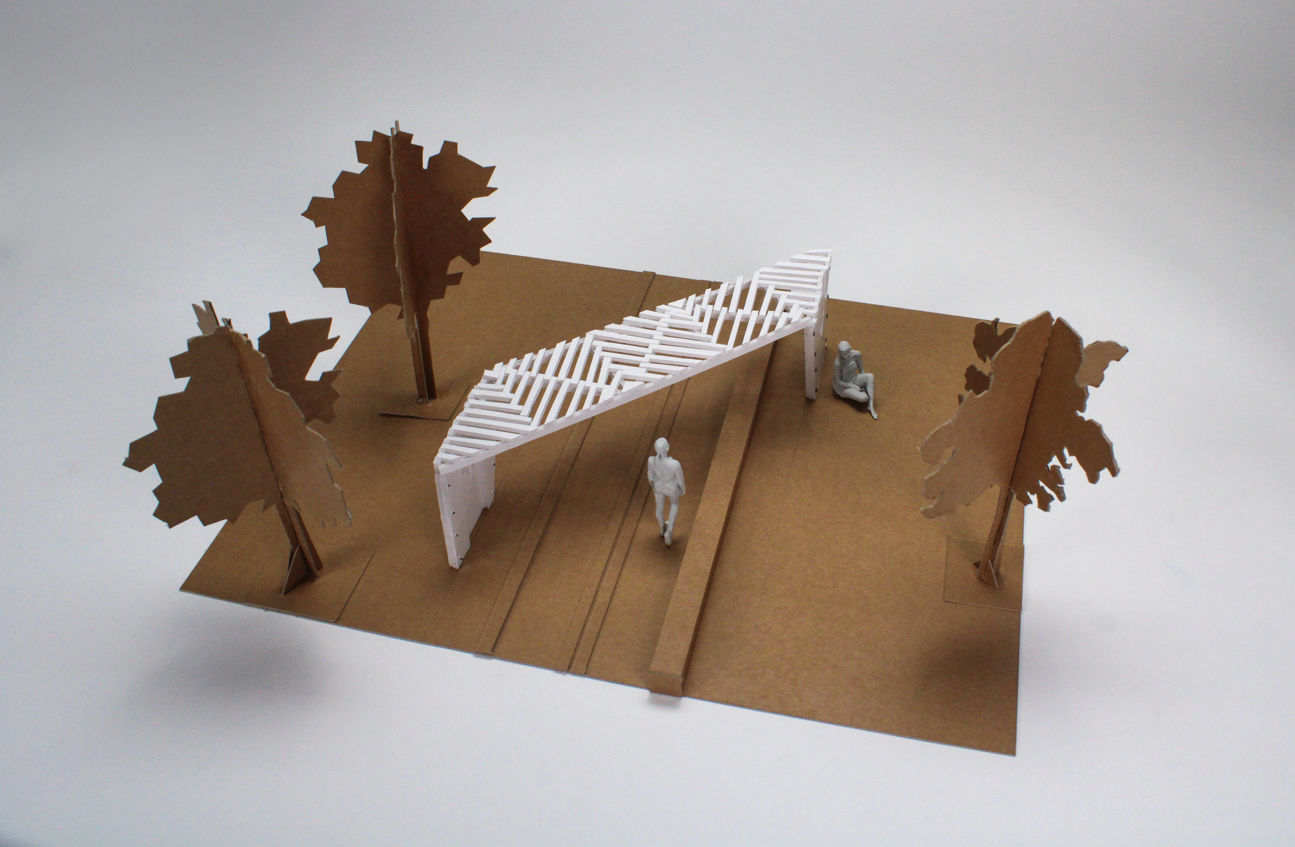 Ma proposition se veut relier les deux pelouses principales tout en soulignant la traversée du square qui, très rarement ombragée, est un lieu de passage très emprunté. Beaucoup d’essais et en papier/carton ont précédé le rendu final.
