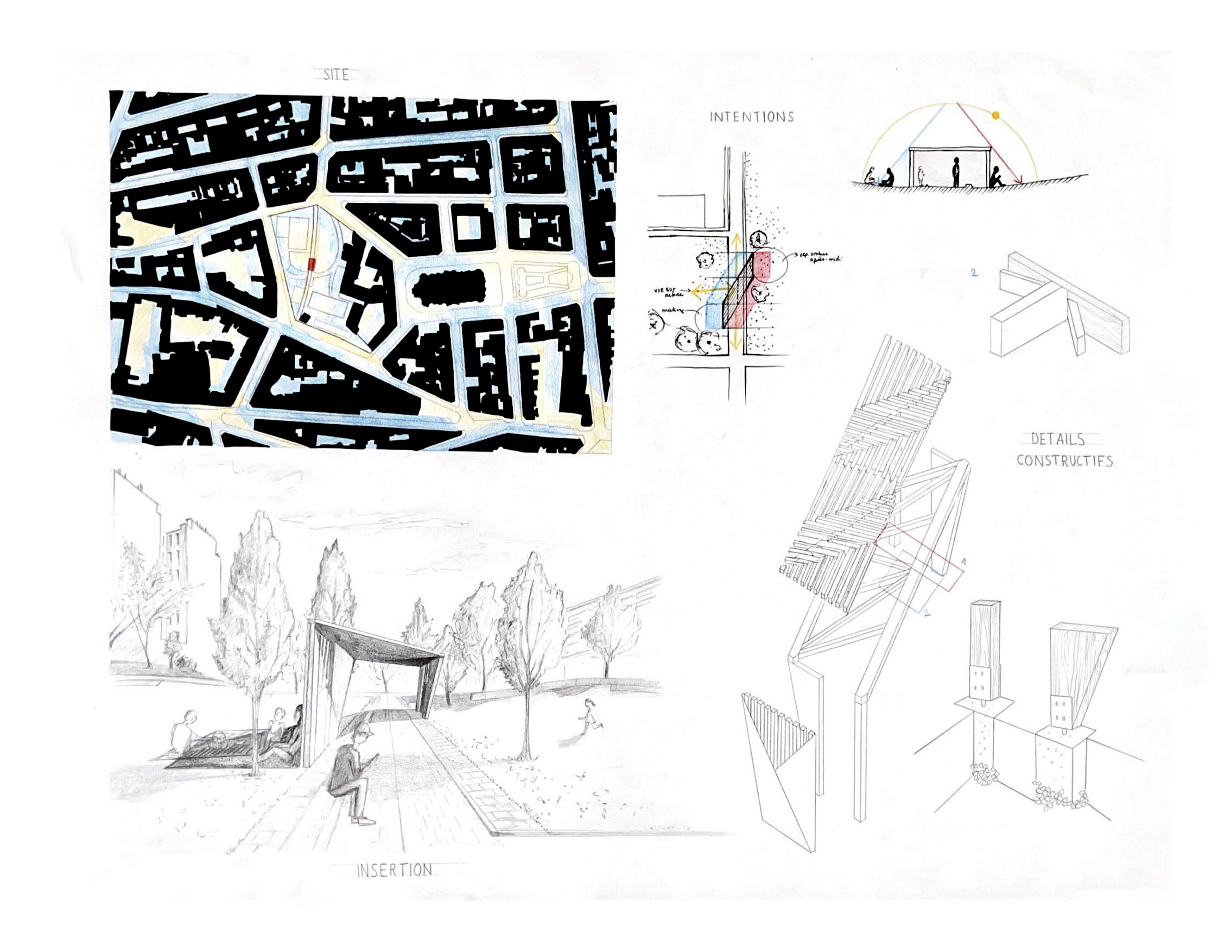 La création de ce petit édifice prend place dans le square Léon (18ème arrondissement). Il s’agit de proposer une installation permanente ayant pour objectif de faire de l’ombre à l’endroit que l’on juge nécessaire.